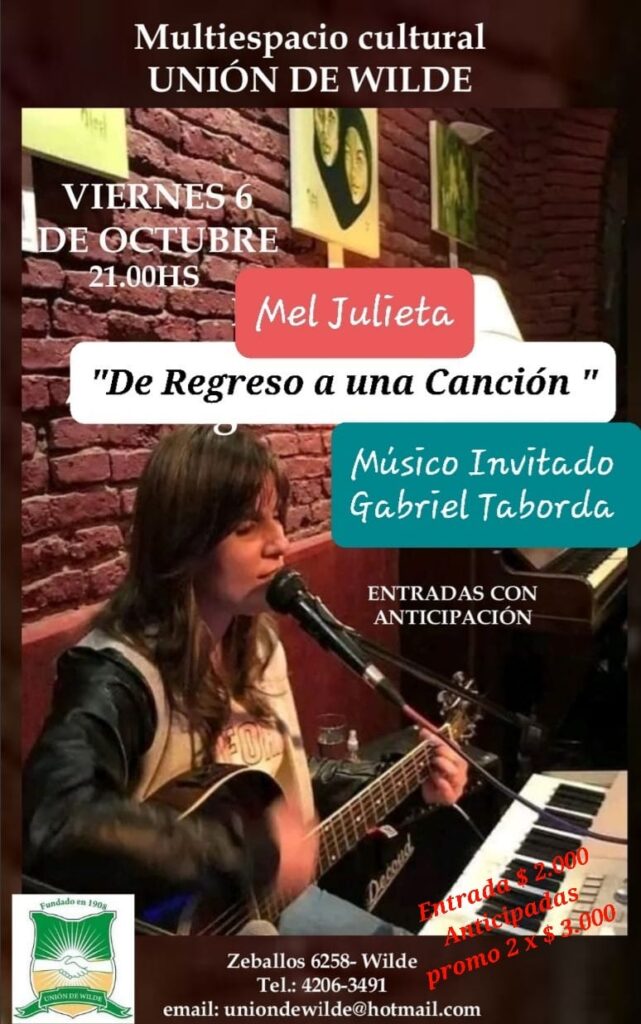 MEL JULIETA en…“De Regreso a una canción”Viernes 06 de Octubre 21 hsTeatro Unión de Wilde.Zeballos 6258. WildeEntradas General: $ 2.000Reservas: 4206-3491