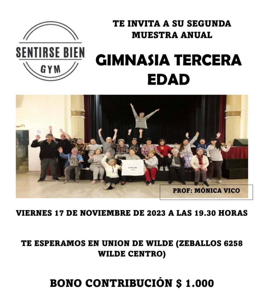 VIERNES 17 de Noviembre 19.30 hs. 2da muestra Anual : Sentirse BienGIMNASIA TERCERA EDAD PROF MÓNICA VICOUNIÓN DE WILDEZeballos 6258. Wilde(a media cuadra de Las Flores) BONO…