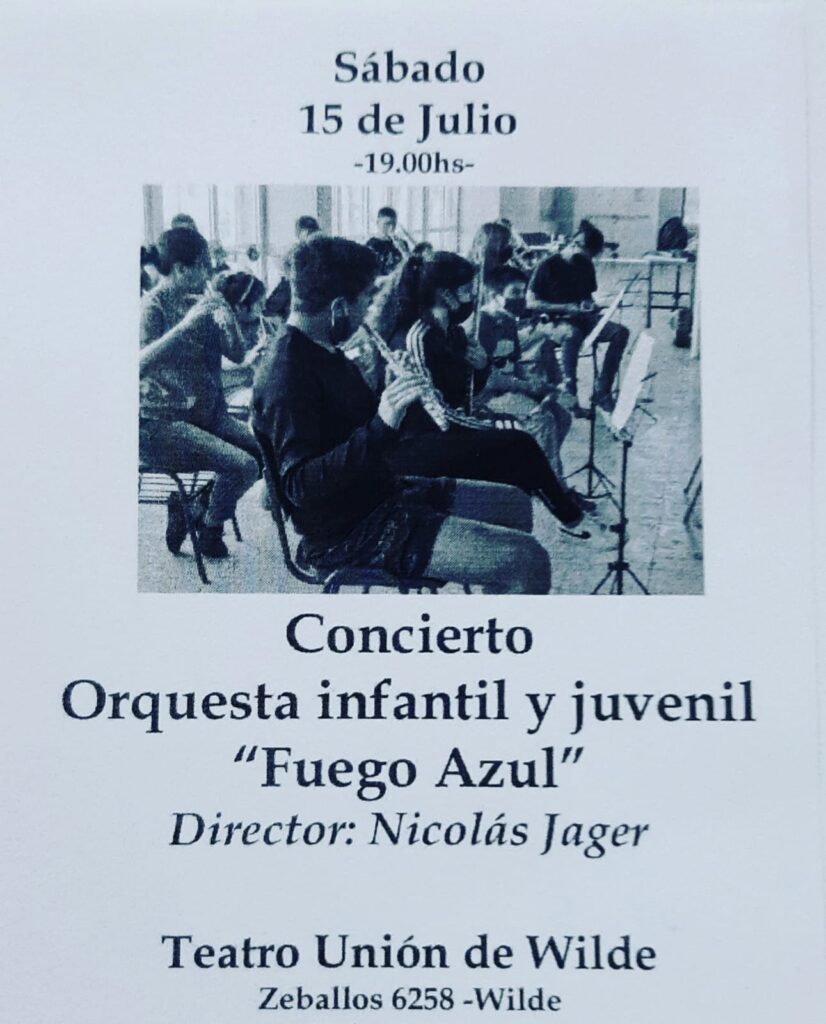 Sábado 15 de Julio 19:00 Hs.Concierto Orquesta Infantil Juvenil “Fuego Azul”Director: Nicolás Jager.Centro Cultural Unión de Wilde. 🎭TEATRO UNIÓN DE WILDE🎭🏛Zeballos 6258 – Wilde☎️Reservas:4206-3491/ WhatsApp 1122498174