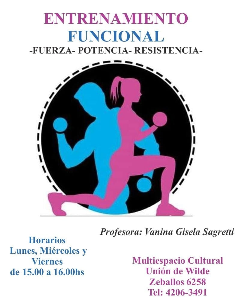 Fuerza – Potencia – ResistenciaProfesora: Vanina SagrettiHorarios: Lunes, Miércoles y Viernes de 15:00 Hs a 16:00 Hs.Multiespacio Cultural Unión de Wilde.🏛Zeballos 6258 – Wilde☎️Consultas:4206-3491