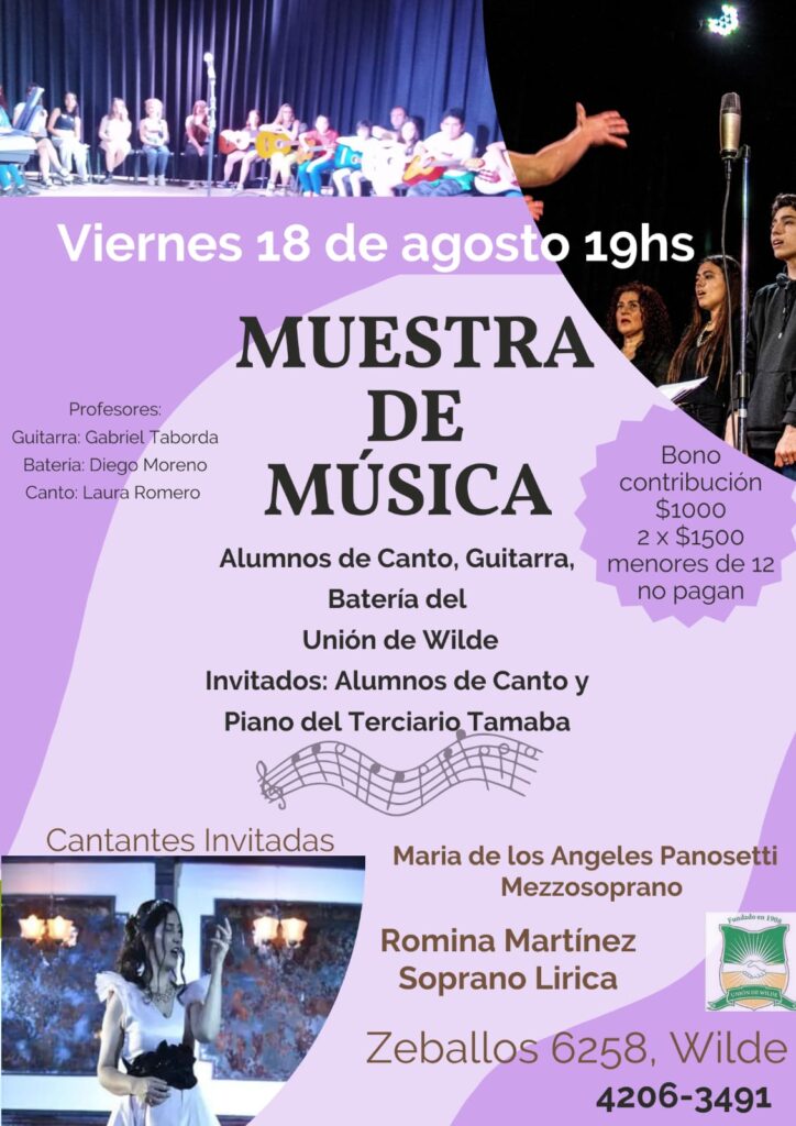 Viernes 18 de Agosto 19 Horas.Muestra de MúsicaAlumnos de canto, Guitarra, Batería del unión de WildeInvitados: Alumnos de canto y Piano del Terciario Tamba.Cantantes invitados: María de…