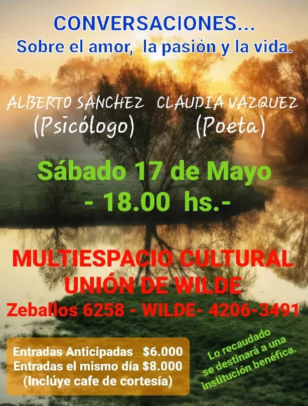 Sábado 17 de Mayo – 18.00 hs. MULTIESPACIO CULTURAL UNIÓN DE WILDEZeballos 6258 – WILDE- 4206-3491 CONVERSACIONES…Sobre el amor, la pasión y la vida. ALBERTO SÁNCHEZ CLAUDIA…