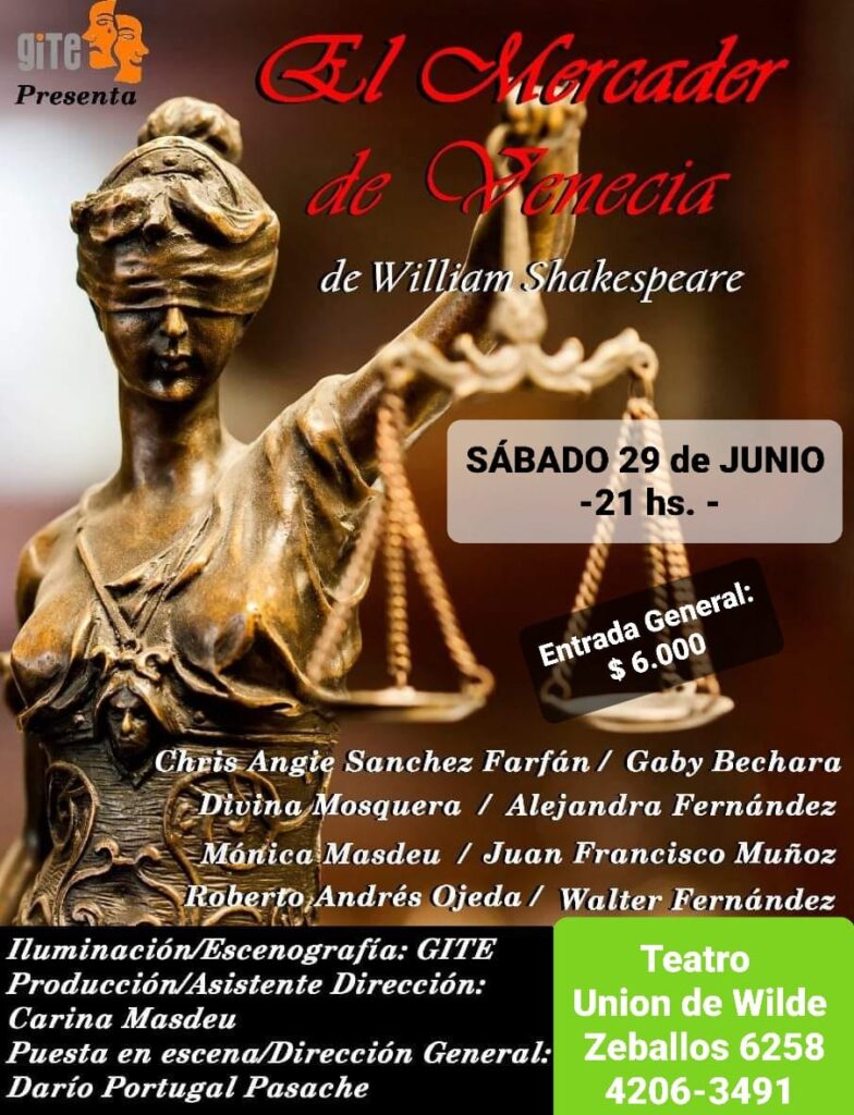 Sábado 29 de junio a las 21 Horas.El Mercader de Venecia de William Shakespeare.Chris Angie Sánchez Farfán / /Gaby Bechra / Divina Mosquera 7 Alejandra Fernández /…