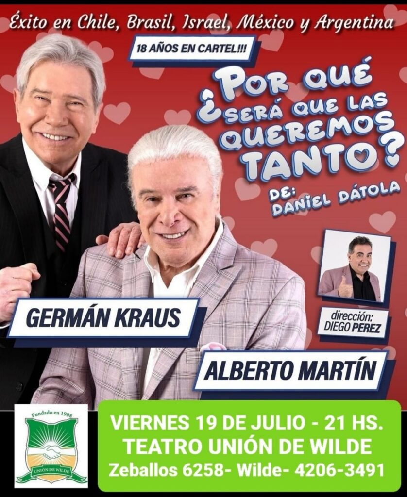OBRA: “PORQUE SERÁ QUE LAS QUEREMOS TANTO”AUTOR: DANIEL DATOLAACTUAN: GERMAN KRAUS – ALBERTO MARTINDIRECCIÓN: DIEGO PEREZ ●VIERNES 19 DE JULIO- 21.00 HS ●ENTRADAS ANTICIPADAS: $ 12.000 ○Boleteria:…