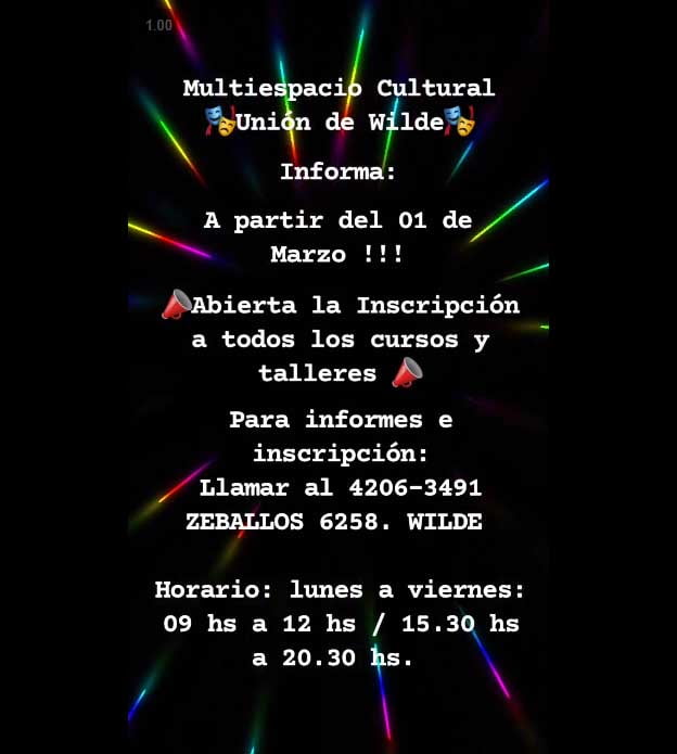 A partir del 1 de Marzo!!!Abierta la inscripción a todos los cursos y talleres.Para informes e inscripción: Llamar al 4206-3491 Zeballos 6258, Wilde.Horario: Lunes a Viernes de…