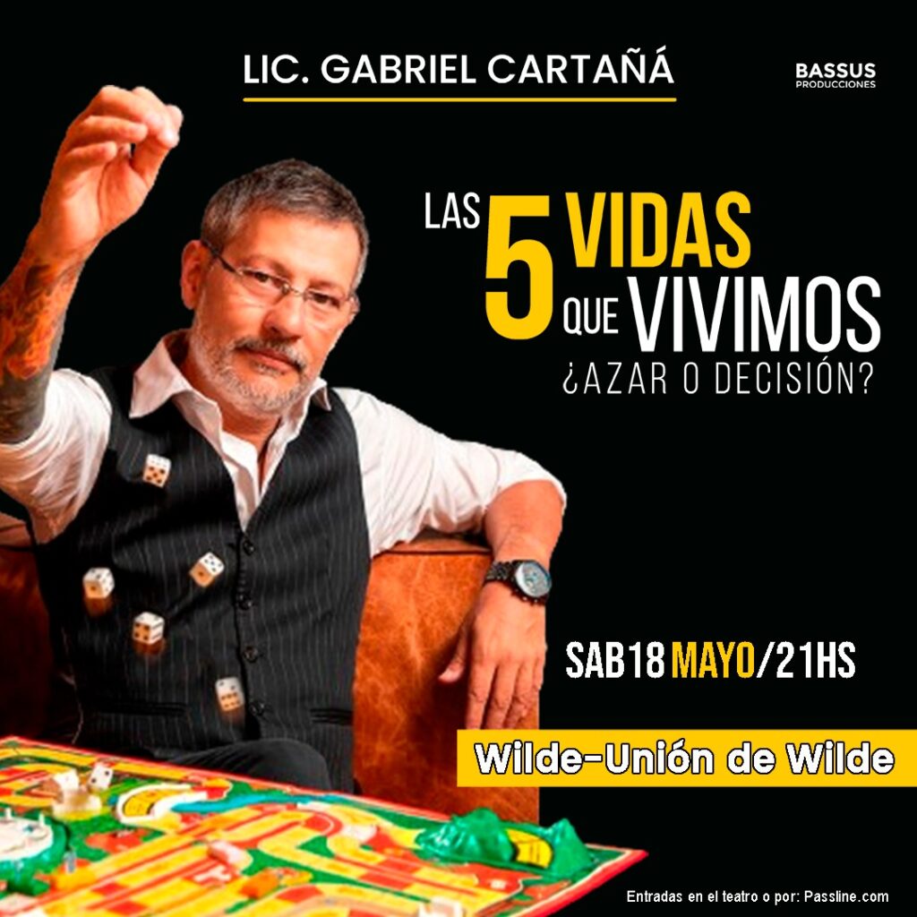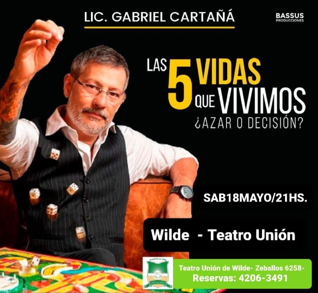 GABRIEL CARTAÑALAS 5 VIDAS QUE VIVIMOS¿Azar o Decisión? SÁBADO 18 DE MAYO – 21 hs. Entrada General: $ 12.000 ENTRADAS:https://www.passline.com/eventos/las-5-vidas-que-vivimos-azar-o-decision-253510O EN EL TEATRO: Horario de Boleteria (solo…